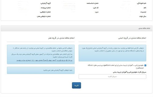 3. در صفحه باز شده اطلاعات ثبت نامی داوطلب قابل مشاهده است از قسمت پایین صفحه می توانید نسبت به اعلام علاقمندی خود از میان گروه هنر و یا تربیت بدنی اقدام نمایید.